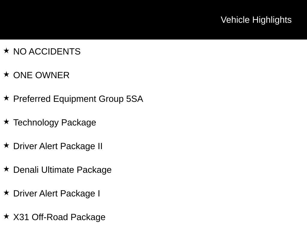 NO ACCIDENTS, ONE OWNER, 12-Volt Rear Auxiliary Power Outlet, 120-Volt Bed Mounted Power Outlet, 120-Volt Instrument Panel Power Outlet, 2 USB Ports, 2 USB Ports (1st Row), 2-Speed Active Transfer Case, 2nd Row Dual USB Charge-Only Ports, 6 Rectangular Chromed Tubular Assist Steps, Auto High-beam Headlights, Automatic Emergency Braking, Bed View Camera w/2 Trailer Camera Provisions, Bose Premium 7 Speaker Sound System, Brake assist, Compass Located In Instrument Cluster, Deep-Tinted Glass, Delay-off headlights, Denali Ultimate Package, Driver Alert Package I, Driver Alert Package II, Dual front impact airbags, Dual front side impact airbags, Electric Rear-Window Defogger, Electrical Lock Control Steering Column, Exterior Parking Camera Rear, Floor-Mounted Center Console, Following Distance Indicator, Forward Collision Alert, Front Chrome Recovery Hooks, Front dual zone A/C, Front fog lights, Fully automatic headlights, GMC Connected Access Capable, Gooseneck/5th Wheel Prep Package, HD Surround Vision w/2 Trailer View Camera Provisions, Heated & Ventilated Front Bucket Seats, Heated 2nd Row Outboard Seats, Heated Driver & Front Outboard Passenger Seats, Hill Descent Control, Inside Rearview Auto-Dimming Rear Camera Mirror, Integrated Trailer Brake Controller, IntelliBeam Automatic High Beam On/Off, Keyless Open & Start, Lane Change Alert w/Side Blind Zone Alert, Lane Departure Warning System, LED Cargo Area Lighting, LED Smoked Amber Roof Marker Lamps, Low tire pressure warning, Manual Tilt-Wheel/Telescoping Steering Column, Multicolor 15 Diagonal Head-Up Display, OnStar & GMC Connected Services Capable, Polished Exhaust Tip, Power Door Locks, Power Front Passenger Windows w/Express Up/Down, Power Rear Windows w/Express Down, Power Sliding Rear Window w/Defogger, Power Sunroof, Power Windows w/Driver Express Up/Down, Preferred Equipment Group 5SA, Premium audio system: Premium GMC Infotainment System, Radio: AM/FM w/Prem GMC Infotainment System & Navi, Rear Cross Traffic Alert, Rear Wheelhouse Liners, Rear window defroster, Remote Vehicle Starter System, Safety Alert Seat, Signature Denali Grille, SiriusXM w/360L, Spray-On Pickup Box Bed Liner w/Denali Logo, Steering Wheel Audio Controls, Technology Package, Traction control, Ultrasonic Front & Rear Park Assist, Unauthorized Entry Theft-Deterrent System, Universal Home Remote, Wheels: 20 Multi-Dimensional Polished Aluminum, Wi-Fi Hotspot Capable, Wireless Charging, Wireless Phone Projection, X31 Off-Road Package. Summit White 2023 GMC Sierra 2500HD Denali 4WD 10-Speed Automatic Duramax 6.6L V8 Turbodiesel